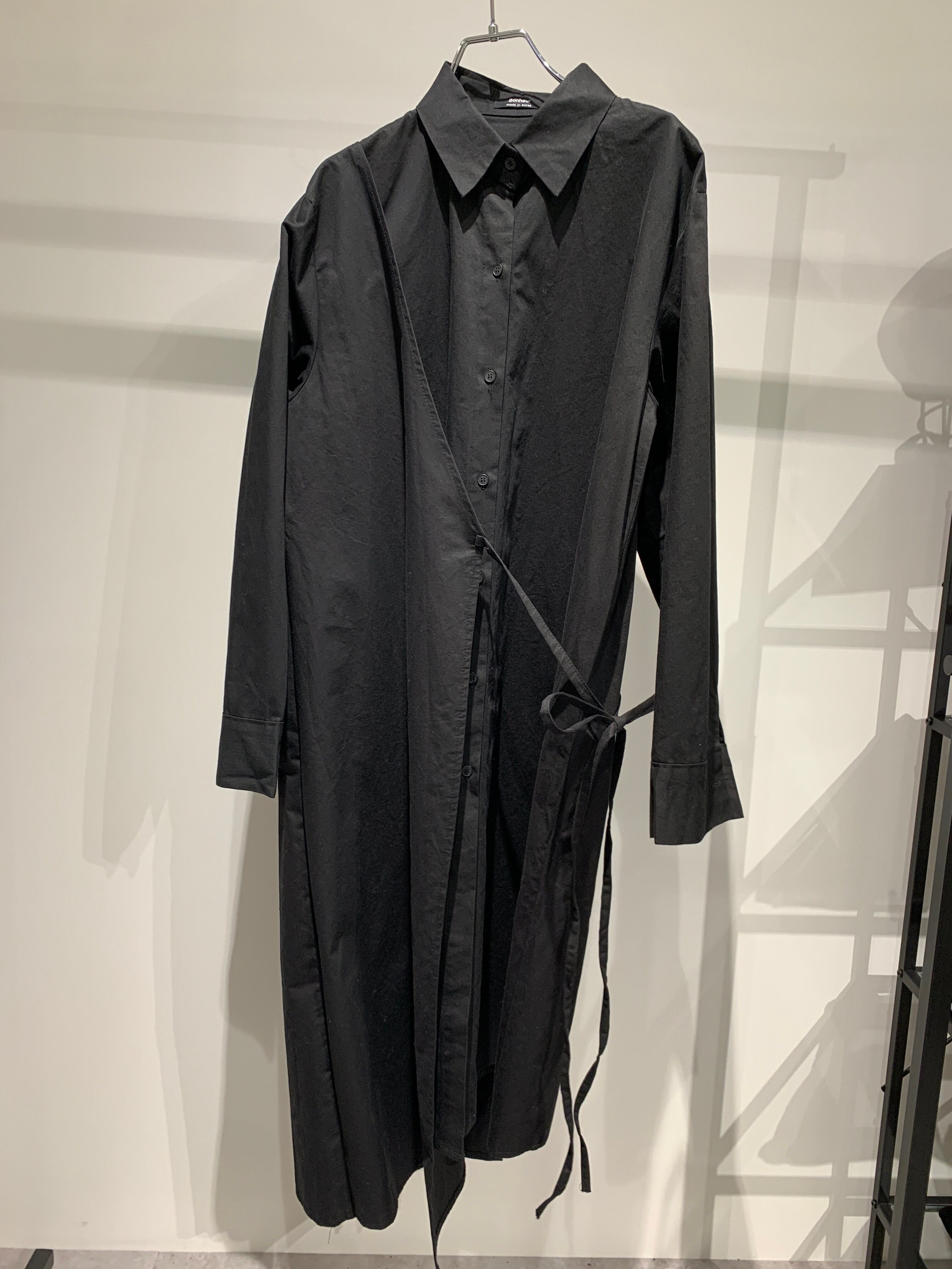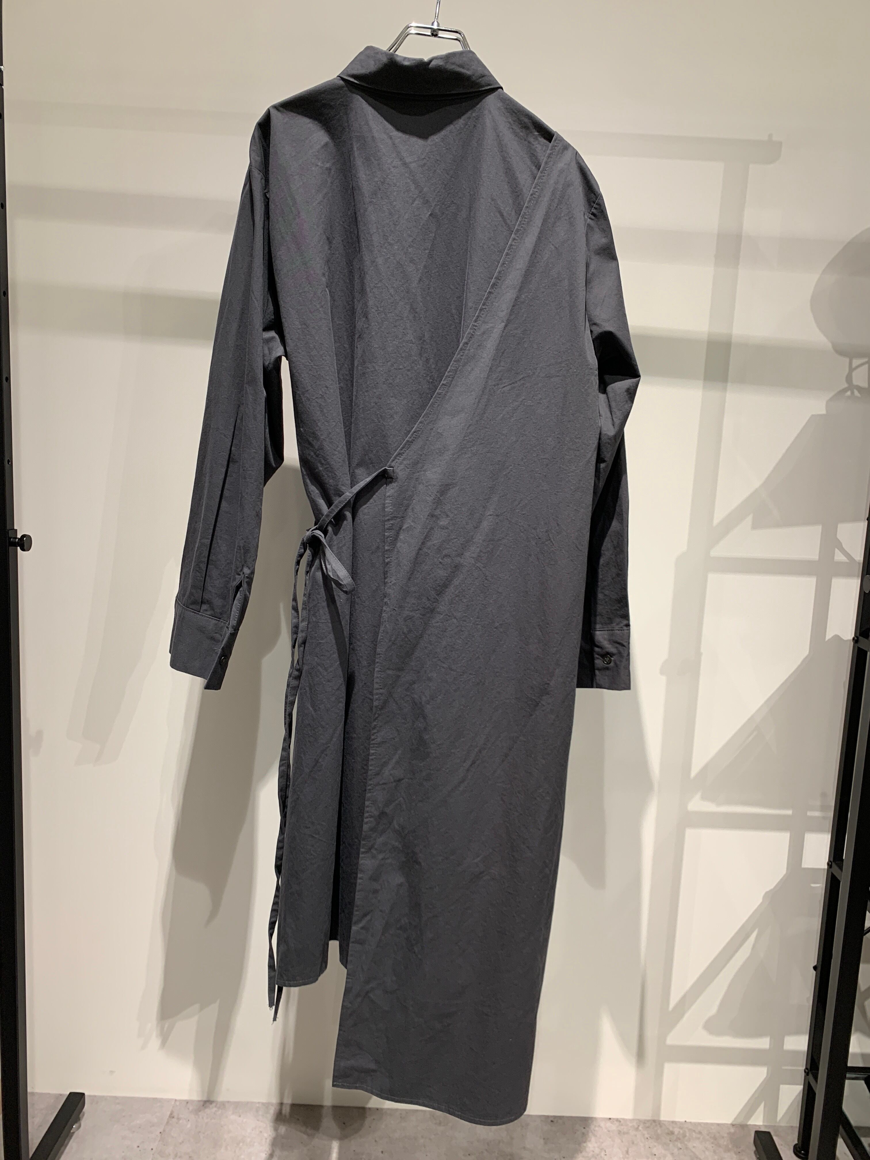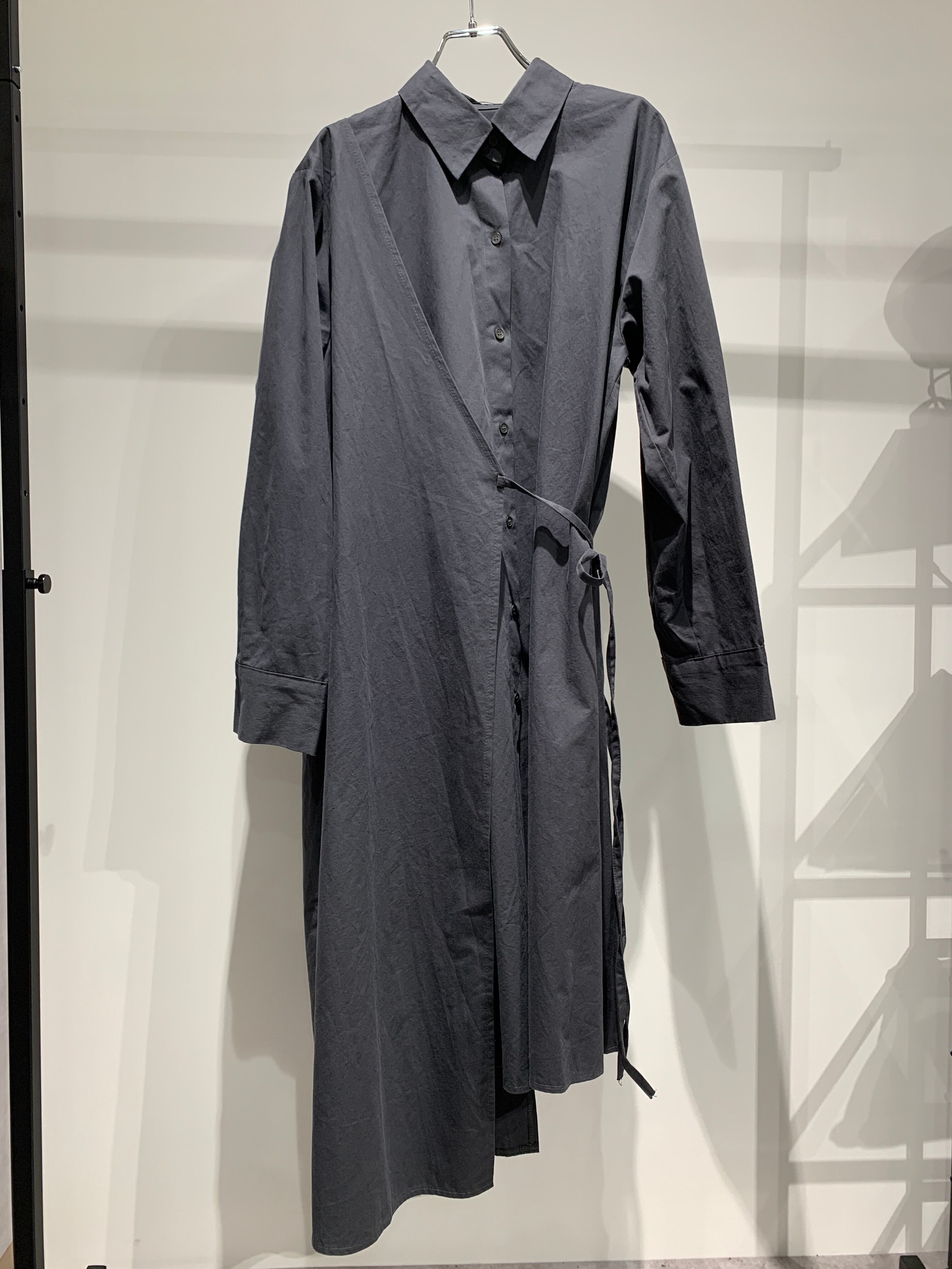 シャツカラーのアシンメトリーなラップワンピース。